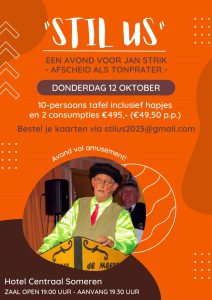 Op 12 oktober neemt Jan afscheid als tonprater, en om dit te markeren heeft de organisatie ‘Stil us’ een afscheidsavond georganiseerd in Hotel Centraal in Someren.