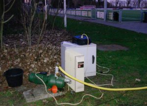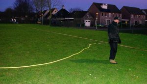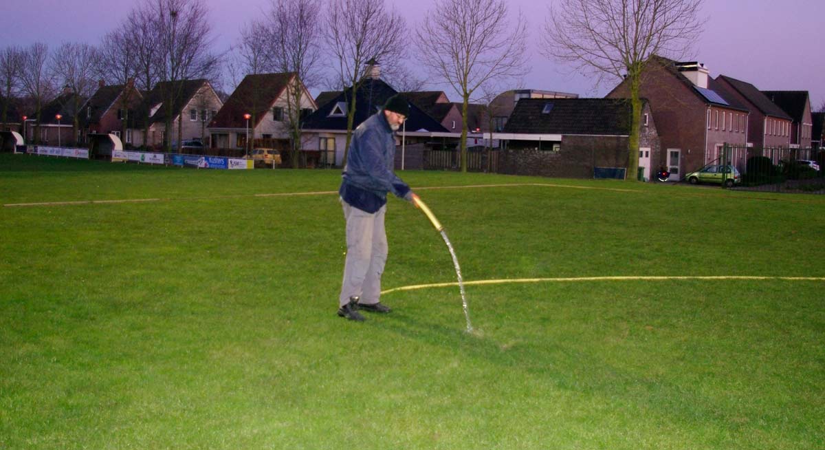 De kop is eraf. Vanmiddag om 17.00 uur is er begonnen met ijs maken voor de schaatsbaan op het voetbalveld.