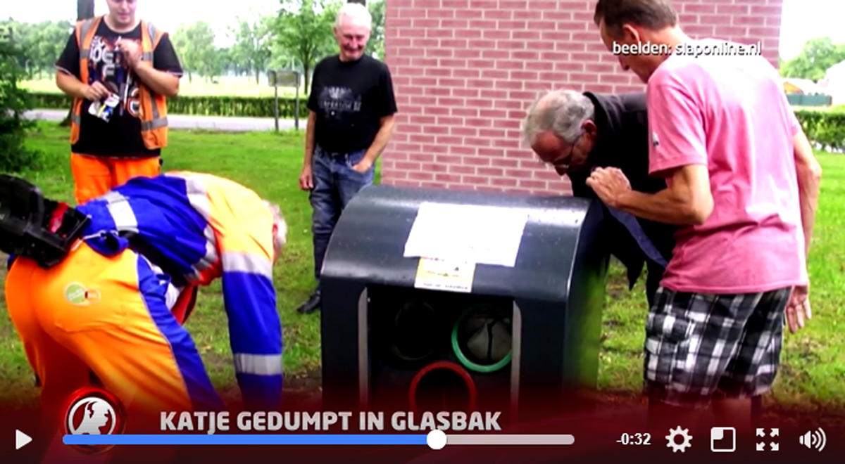Het bericht van afgelopen dinsdag over de reddingsactie van een katje uit de glasbak aan de Kromvenweg was populair bij diverse landelijke media (die waarschijnlijk ook last hebben van de komkommertijd?).