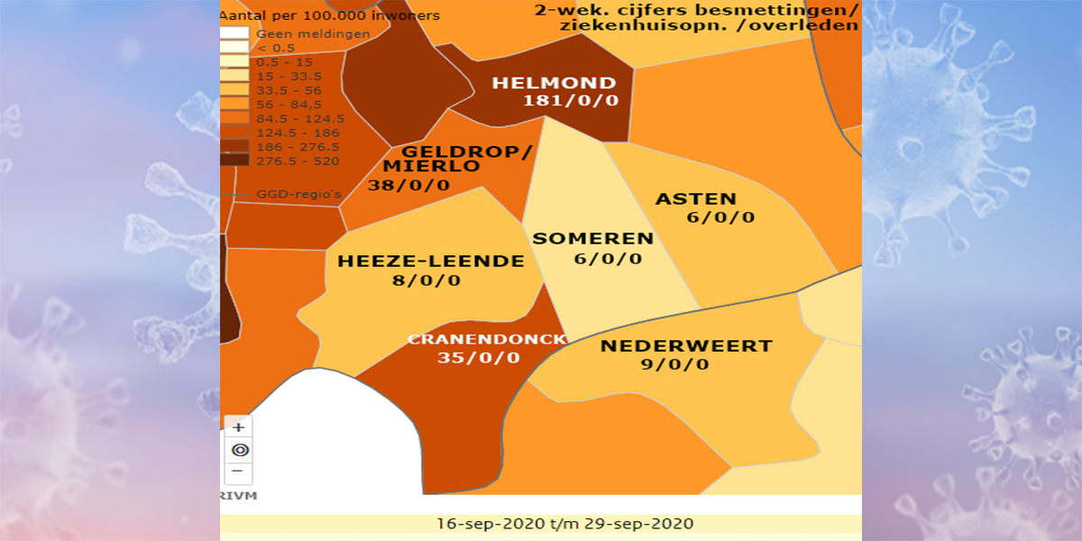 Zoals te zien is het aantal besmettingen in deze periode met ruim 450% opgelopen tot 283 waarbij opvalt dat de gemeente Helmond hierin het grootste aandeel had met 181 besmettingen. Ook Mierlo en Cranendonck stegen fors tov 14 dagen geleden. De gemeente Someren zit, evenals Asten met 6 nieuwe besmettingen aan de lage kant. Opvallend is dat er bij ons, maar ook bij de andere gemeentes geen ziekenhuisopnames zijn geweest. Ook waren er geen sterfgevallen vanwege de corona.