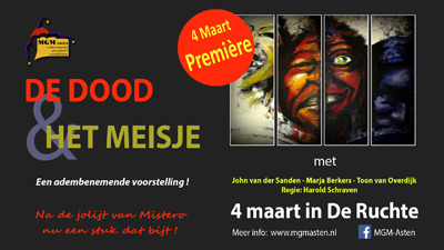 Wie dichtbij huis een eigentijds muziektheater wil zien kan op zaterdag 4 maart terecht in de Ruchte in Someren waar na het succes van ‘Mistero’ MGM Asten terug is met ‘De dood en het Meisje’ (premiere).