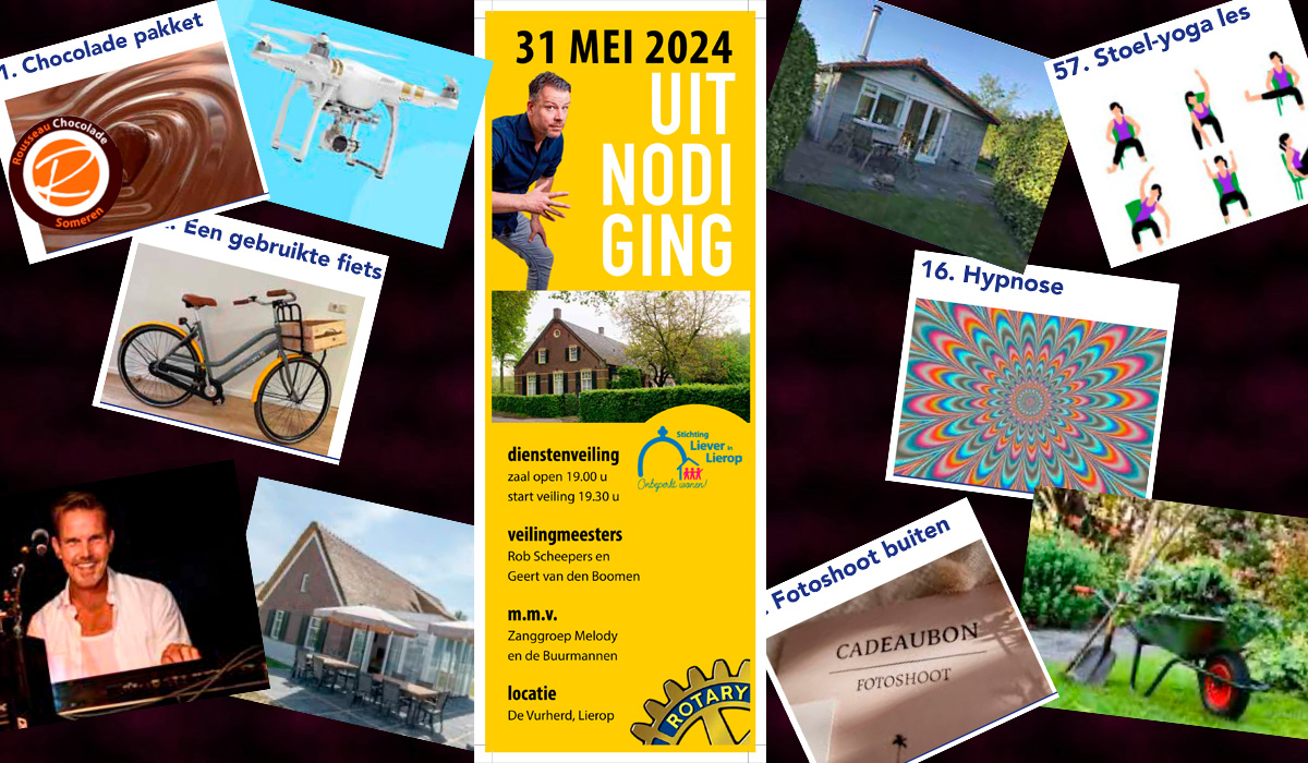 Na de eerdere berichten over de dienstenveiling voor ‘Liever in Lierop’, die a.s. vrijdag 31 mei in de Vurherd zal plaatsvinden, hebben we nu ook de ‘diensten’ waarop geboden kan worden van de organisatie gekregen.