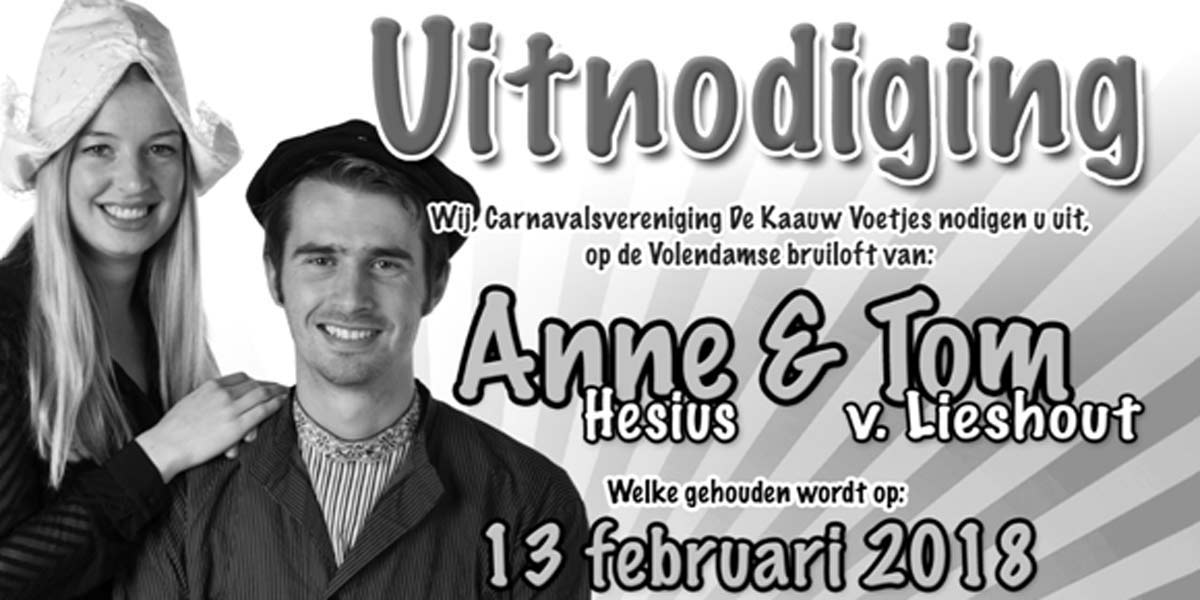 Op carnavalsdinsdag 13 februari vanaf 14.00 uur zullen Anne Hesius en Tom van Lieshout als Volendams Paar een groot (bruilofts)feest geven in de residentie van de Kaauw Voetjes, zaal van Oosterhout.