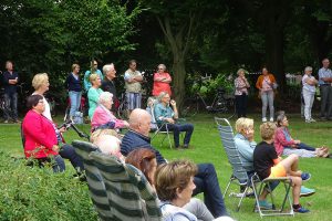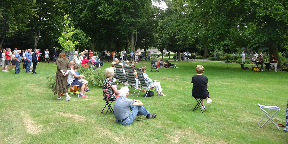 Het oorspronkelijke idee om op ’t plateau op te treden werd ingeleverd voor een optreden onder een grote beuk omdat daar wel volop ruimte was om daar waar nodig afstand tot elkaar te bewaren.
