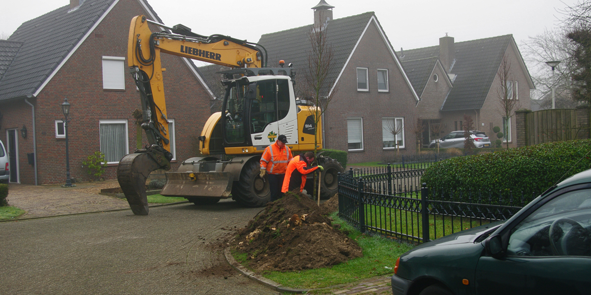 Vorig jaar zijn alle bomen verwijderd en sinds eind vorige week zijn ze bezig met het plaatsen van – weliswaar minder – nieuwe bomen die de buurt hopelijk gaan opfleuren.