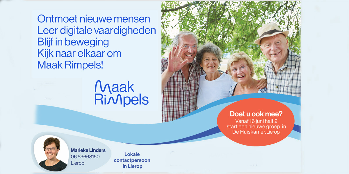 Leef de dag, juist als je 65+ bent! Hoe doe je dat? Met het brede gezondheidsprogramma van ‘Maak Rimpels’ in ‘De Huiskamer’ in Lierop geven wij u handvatten en tips. Ruim honderd enthousiaste deelnemers gingen u al voor in Someren. Het wordt gratis aangeboden door uw gemeente, in samenwerking met de ziektekostenverzekeraars en huisartsenorganisaties. U rekent alleen de thee en koffie zelf af.