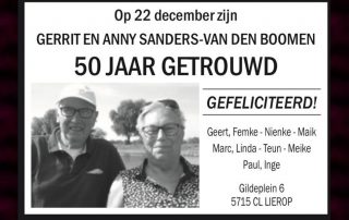 Van de kinderen Sanders kregen we het bericht dat Gerrit en Anny vandaag maar liefst 50 jaar getrouwd zijn. Ook proficiat namens ons.