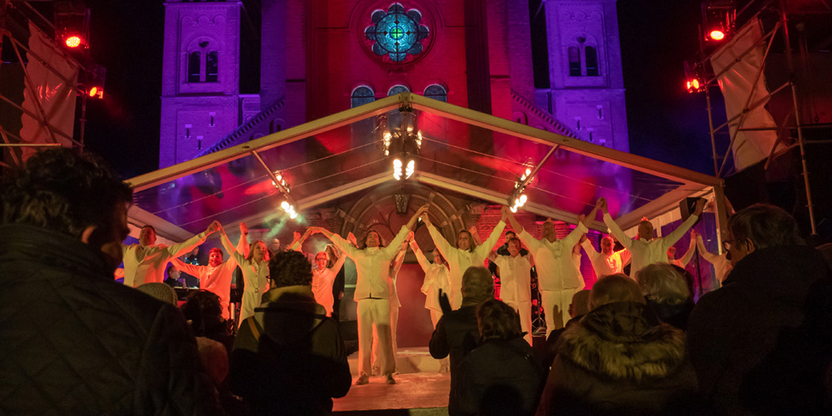 Tijdens de voorstelling werd er drie keer uitgeweken naar het tweede podium achter de muur van de pastorietuin wat een verrassend effect gaf in het geheel. Ook de bazuinblazers vanuit de twee kerktorens vielen onder de categorie ‘verrassend’.