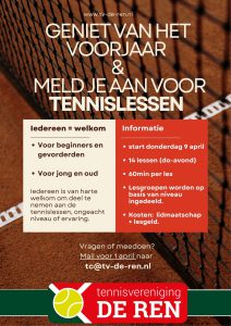 Het voorjaar staat voor de deur, en dat betekent dat er weer een nieuwe lessenreeks van start gaat bij Tennisvereniging De Ren. We nodigen alle Lieroppenaren van harte uit om zich aan te melden en samen met ons het tennisseizoen sportief af te trappen.