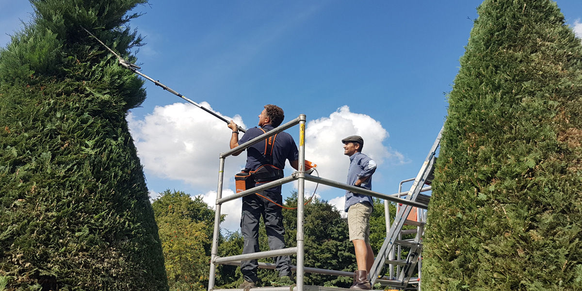 Hoewel een groep vaste vrijwilligers het jaar rond zorgt dat het kerkhof, de pastorietuin en het park er piekfijn bij liggen, werd het toch hoog tijd om alle hagen, vormconiferen en leilindes hun jaarlijkse scheerbeurt te geven.