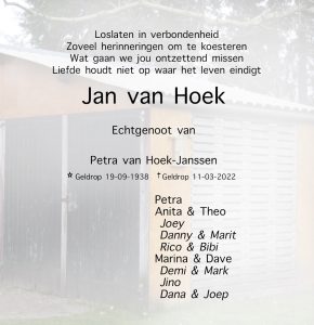 Anita van Hoek stuurde ons namens de familie van Hoek het bericht dat Jan op vrijdag 11 maart is overleden.