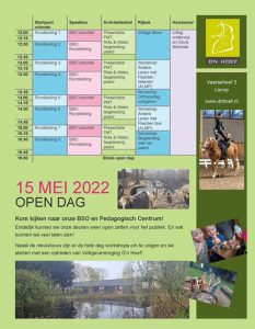 Naast de nieuwbouw zijn er de hele dag workshops om te volgen en we starten met een optreden van Voltigevereniging D’n Hoef”.
