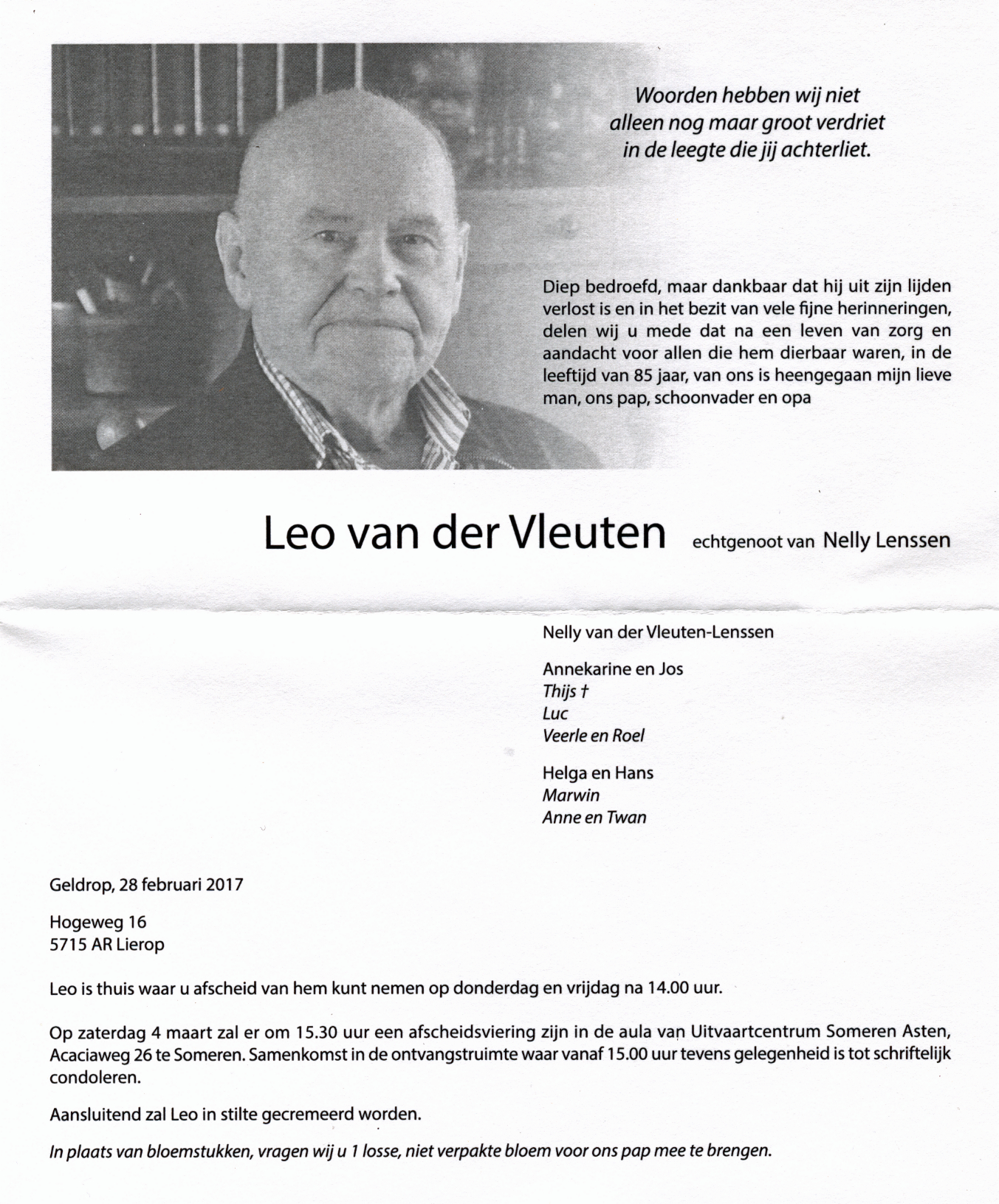 Van de familie van der Vleuten kregen wij het bericht dat Leo van der Vleuten afgelopen dinsdag 28 februari op 85-jarige leeftijd is overleden.