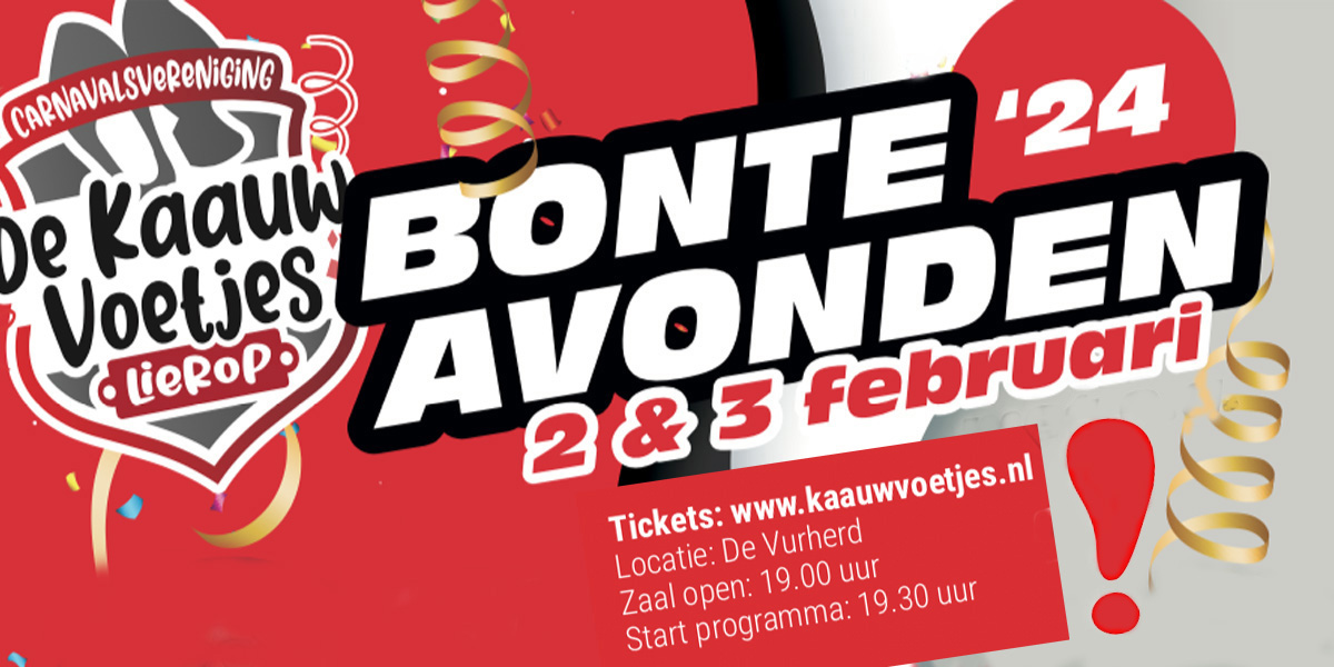 Zaterdag is uitverkocht, voor de vrijdag zijn er nog kaartjes! Het wordt prachtig dus mis een van de mooiste Bonte Avonden ooit niet!!!