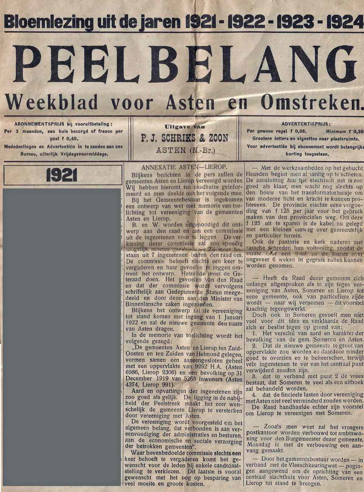 Van een trouwe lezer kregen we een krantenknipsel over Lierop uit 1921! Dachten we altijd dat Lierop ‘na veel gedoe’ in 1935 samengevoegd werd bij Someren, blijkt nu dat al lang daarvoor Lierop – bijna – bij Asten hoorde. Het is allemaal te lezen in een editie uit 1921 van het toen al bestaande Peelbelang waarin de intentie om op 1 januari 1922 de beide gemeentes officieel samen te voegen staat beschreven. Hierbij zou de nieuwe gemeente Asten gaan heten.