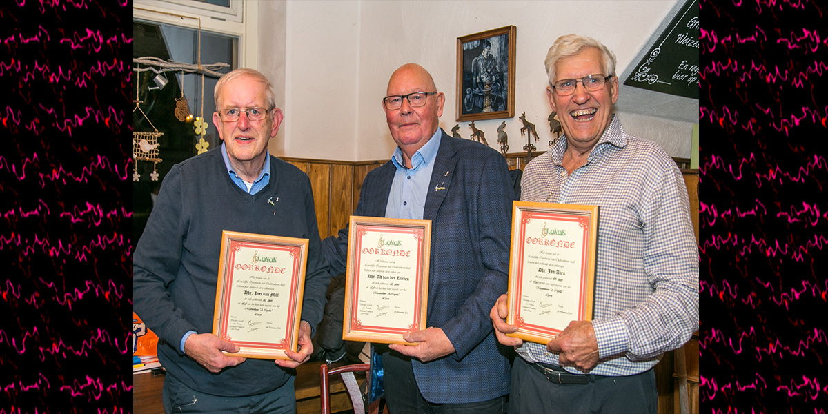 ‘Afgelopen zaterdag 24 november heeft mannenkoor A Capella 3 leden gehuldigd vanwege hun 50 jaar lidmaatschap. Jan Aben, Ad van der Zanden en Piet van Mill mochten hun gouden jubileum vieren. Bij café ’t Pastoorke van Moorsel kregen zij uit handen van voorzitter Klaas Wubs en secretaris Jo Dat het gouden eremetaal uitgereikt dat door Jan z’n dochter Heidi, Ad z’n schoonzus Nelly en Piet z’n vouw Lies werd opgespeld. Ook werden ze later op de avond nog eens gehuldigd door een afvaardiging van de muziekbond het Lovok met een oorkonde en een speld van waardering. Met het zingen van de Toast door het koor en een geweldig optreden van entertainer Michiel Malschaert was het feest compleet en kunnen de jubilarissen terugzien op een eervolle huldiging’.