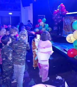 De dj wist al snel de dansvloer vol te krijgen en zo begon het feestje goed. Tussendoor werden er leuke spelletjes gedaan en konden de kinderen prijsjes winnen. Tijdens het 1e spel streden Prins Roel en Boer Keano tegen elkaar, Keano won de wedstrijd. Het tweede spel ‘de mummy’, werd in tweetallen gespeeld. Hierbij moesten de kinderen elkaar zo snel mogelijk tot een echt mummy inpakken met wc papier.