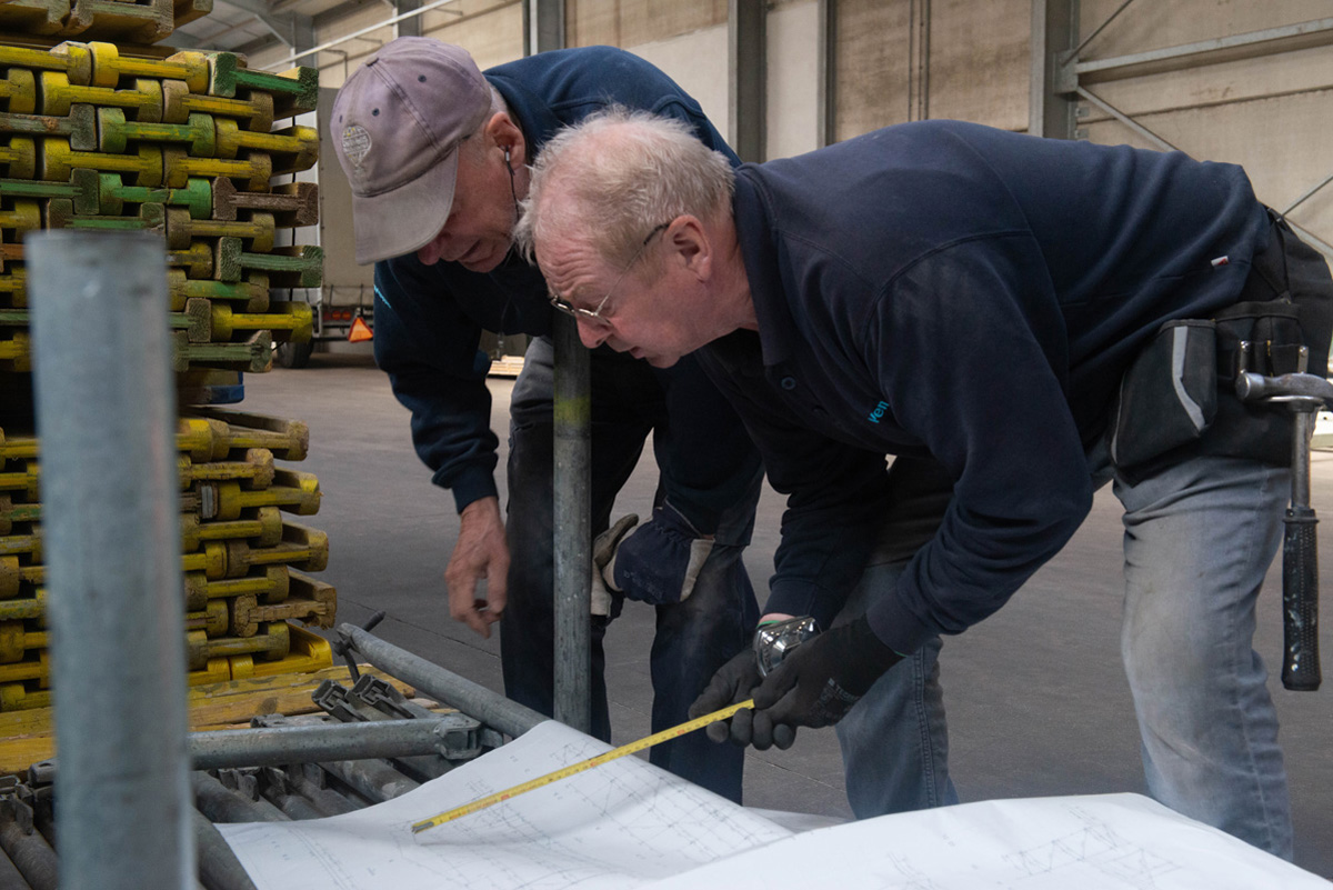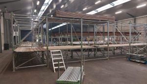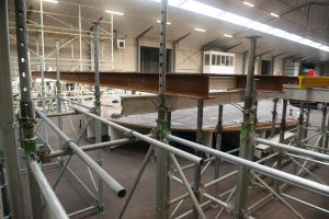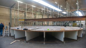 Het enorme podium van plm 25 x 25 x 8 meter waarin een draaibaar deel verwerkt wordt begint al gestalte te krijgen en ook aan het bouwen van de tribune voor de zitplaatsen is een begin gemaakt.
