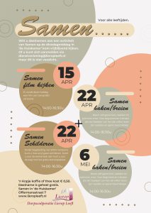 De werkgroep ‘Dienstverlening & Communicatie’ van Lierop Leeft heeft weer een nieuw programma gepresenteerd voor de komende ‘Samen’ activiteiten voor jong en oud op de dinsdagmiddagen in ‘de Huiskamer’ van Henricushof.