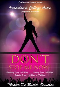 Deze week op 7, 8 en 9 juni spelen leerlingen en leraren van het Varendonck College Asten de musical “Don’t Stop Me Now”. Meer dan 60 leerlingen en docenten bereiden zich al het hele schooljaar voor op de uitvoering in juni. “Don’t stop me now” vertelt het verhaal van een wereld 300 jaar in de toekomst, waar door mensen gemaakte muziek, op echte instrumenten, verboden wordt door de Killer Queen. De enige muziek die wordt toegestaan is digitaal geproduceerde muziek. Galileo en Scaramouche komen samen met een groep jongeren, de Bohemiens, hiertegen in opstand en gaan op zoek naar de handgemaakte rockmuziek!