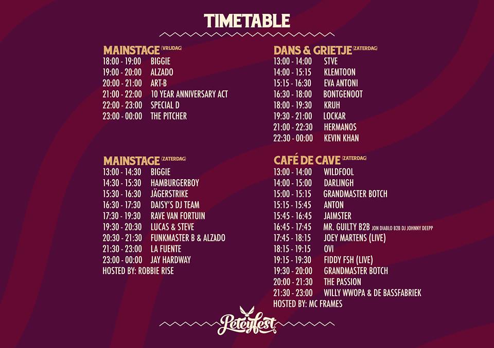 Vrijdag 19 en zaterdag 20 mei zal het eerste Lieropse Festival van dit jaar plaatsvinden in Lierop. Peteyfest 2017! Het wordt tevens een jubileumeditie. Al voor de 10e keer zal dit dance festival plaatsvinden. Het festivalterrein was nog nooit zo mooi en ook de line-up ziet er weer geweldig uit. Bijgaand de timetable. Zorg dat jij en je vrienden vroeg op het festivalterrein zijn en mis niets van jouw favoriete artiesten!