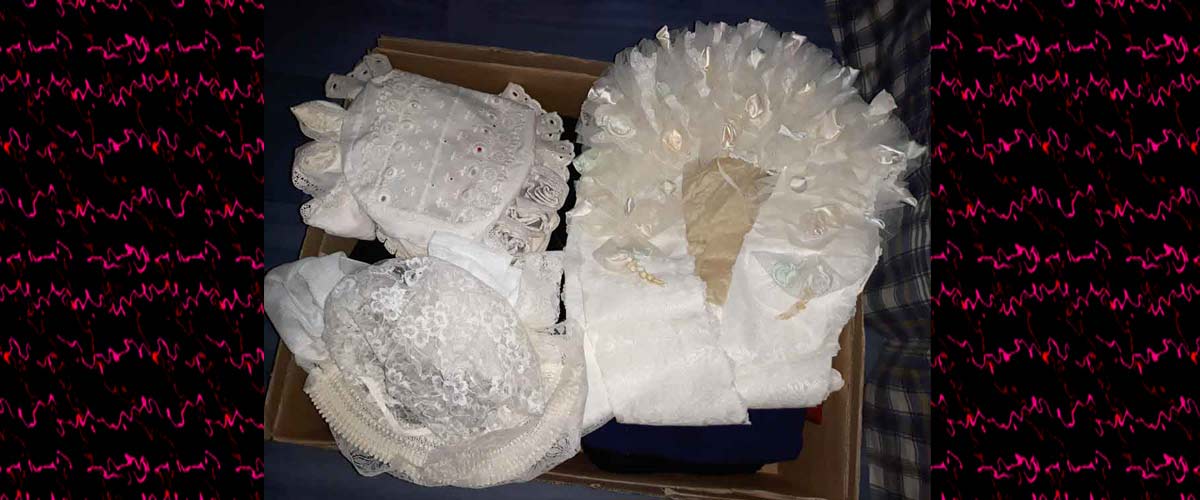 Prachtige poffer en 3 mutsen en ’n broek met bretels etc.