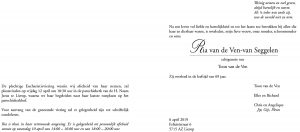 Van de familie van de Ven kregen we het bericht dat Ria afgelopen zaterdag 6 april op 69-jarige leeftijd is overleden.