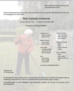 Van de familie Gubbels kregen we het bericht dat Riek afgelopen zondag, 29 november, op 91-jarige leeftijd is overleden.