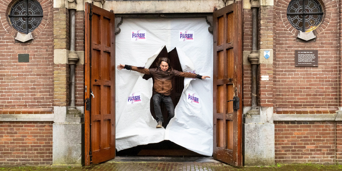 Een van de hoofdrollen van de nieuwe Passie, Jezus, die ingevuld gaat worden door Mari Maas, had gisteren een andere wel heel aparte rol bij de Kick Off. Hij sprong door de dichtgeplakte buitendeuren van de kerk naar buiten en liet daarmee op symbolische wijze zien dat we met de editie van de Passie 2022 naar buiten gaan. Na zijn eenzame actie kon ook de online presentatie van de Kick Off starten voor alle deelnemers en vrijwilligers van de nieuwe Passie die voor 2 april 2022 ingepland staat.
