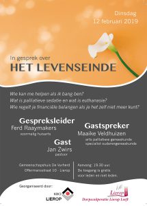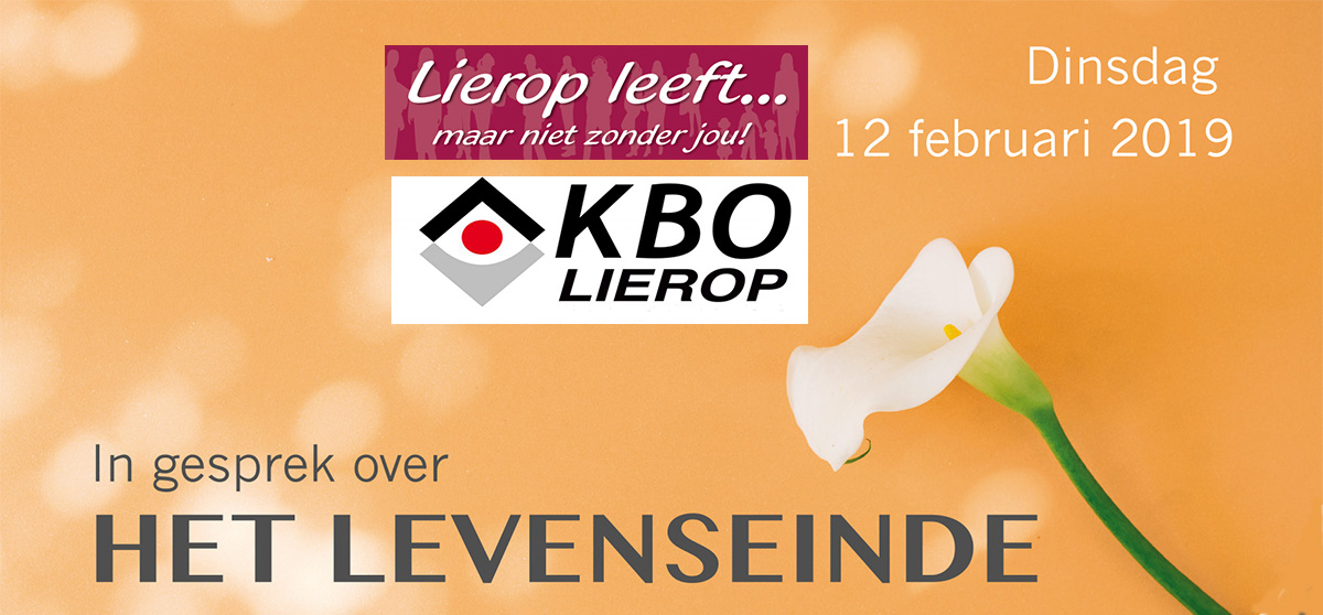 De KBO en Dorpscoöperatie ‘Lierop Leeft’ organiseren op dinsdag 12 februari een thema-bijeenkomst met als onderwerp ‘In gesprek over het levenseinde’. Deze bijeenkomst is in gemeenschapshuis De Vurherd, Offermansstraat 10 in Lierop en begint om 19.30 uur.