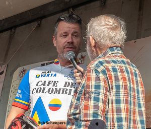 Een andere deelnemer uit de regio is ROB SCHEEPERS uit Sterksel. De comedian en tonproater tijdens de carnavalsperiode staat vooral bekend om zijn onvervalste “one-liners”. Die waren ook te zien en te horen in de TV-serie “Paboem Patsss.” Vorig jaar baarde hij opzien door in de TDOBC van start te gaan in een origineel Café de Colombia-shirt. Een vooruitziende blik met het oog op de Tour?