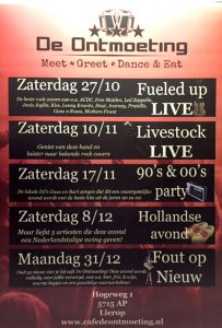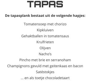 Patrick Breedveld stuurde ons vanuit De Ontmoeting naast de poster van de evenementen die er in 2018 nog plaatsvinden, het bericht dat het vanaf volgende week vrijdag (16 november) mogelijk is elke vrijdagavond van 18.00 tot 21.00 uur tapas te eten.