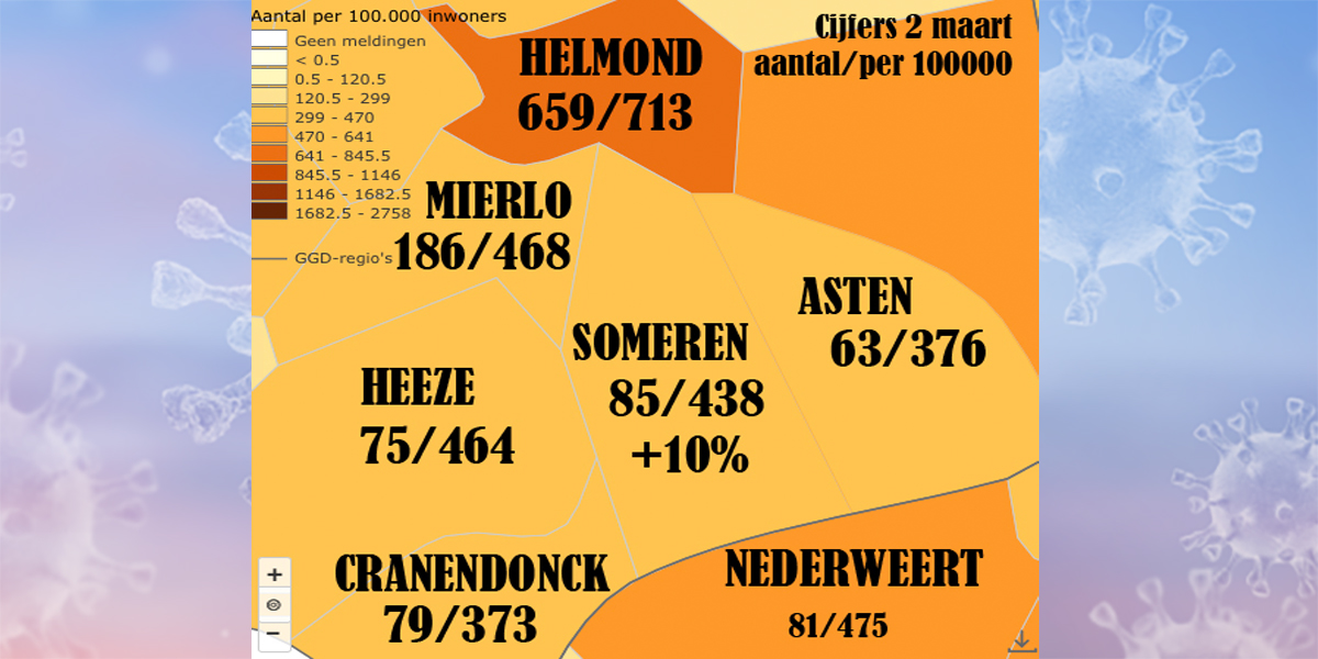 De gemeente Someren is afgelopen week met 10% gestegen wat betreft het aantal besmettingen. Een lichte verhoging dus. Bij onze buurgemeentes hadden Asten en Cranendonck iets minder besmettingen maar ook de rest steeg licht. Helmond deed het met 15% meer besmettingen het slechtst en kleurt daarmee steeds roder.