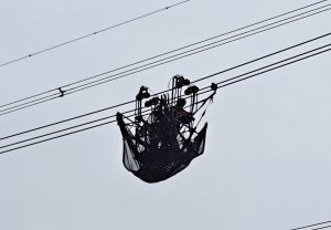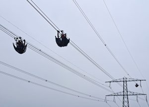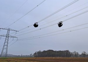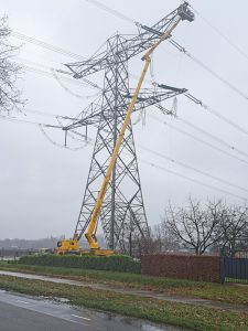 Het traject van deze hoogspanningsmasten passeert ook Lierop. Bij een van de masten langs de Herselseweg leverde dat bijgaande foto’s op van wel een heel knap staaltje ‘werken onder spanning’.